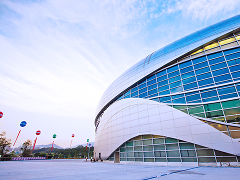 馆外形呈椭圆的不规则形状如跳动火焰,柔和的线条围绕建筑延伸旋转展现流畅的曲面外形,营造高贵、优雅的风格,充满生命律动感。